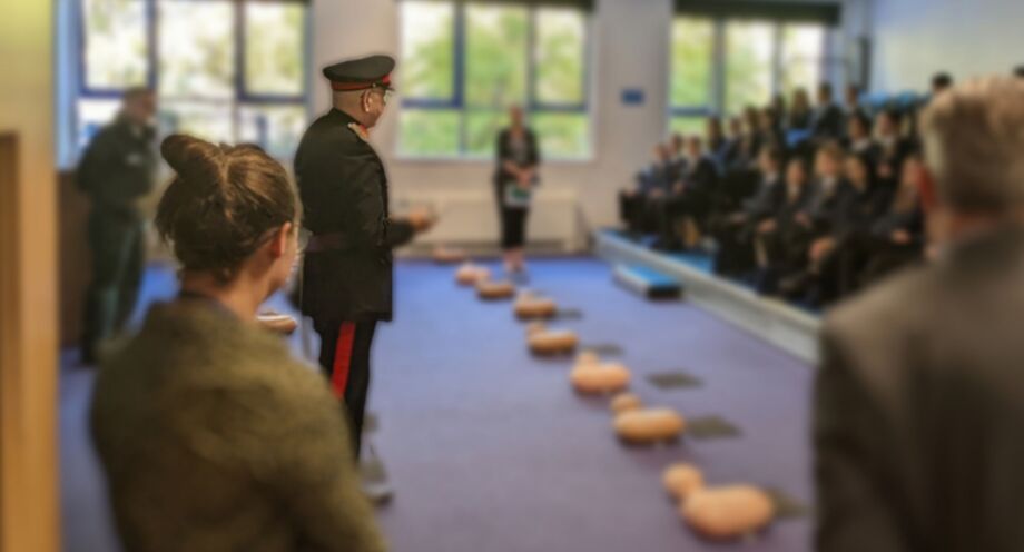 His Majesty King Charles III was represented by The Deputy Lieutenant of West Yorkshire, Major Stan Hardy at Cockburn School. He came to commend the Yorkshire Ambulance staff who spent the day teaching CPR to all students in Year 8 and to talk to the pupils about a girl from another school who had taken part in the training last year and who had saved the life of her grandfather on Christmas day when he went into cardiac arrest. The Deputy Lieutenant praised the pupils saying how focused and respectful they were.